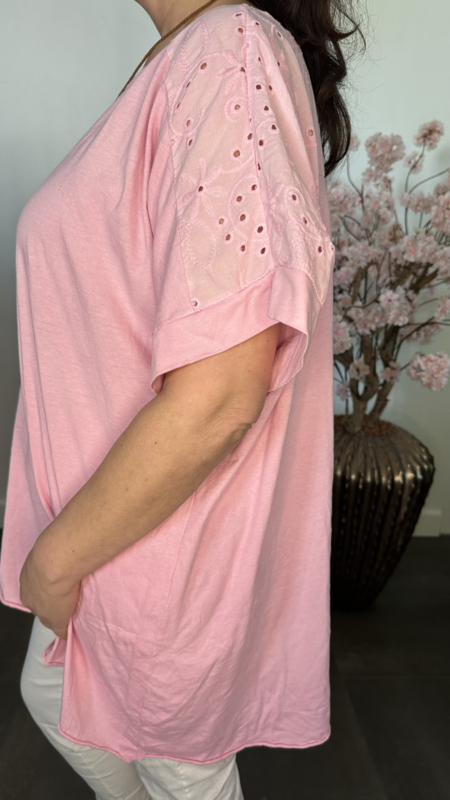 De verfijnde broderie inzet op de schouders en rug geeft het T-shirt een vrouwelijke en stijlvolle uitstraling met een subtiel speels effect. Ideaal om zowel casual te dragen als iets chiquer te stylen.