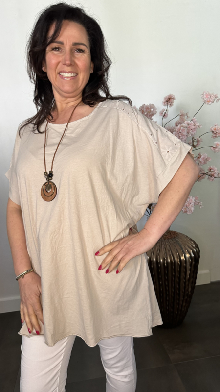 De verfijnde broderie inzet op de schouders en rug geeft het T-shirt een vrouwelijke en stijlvolle uitstraling met een subtiel speels effect. Ideaal om zowel casual te dragen als iets chiquer te stylen.