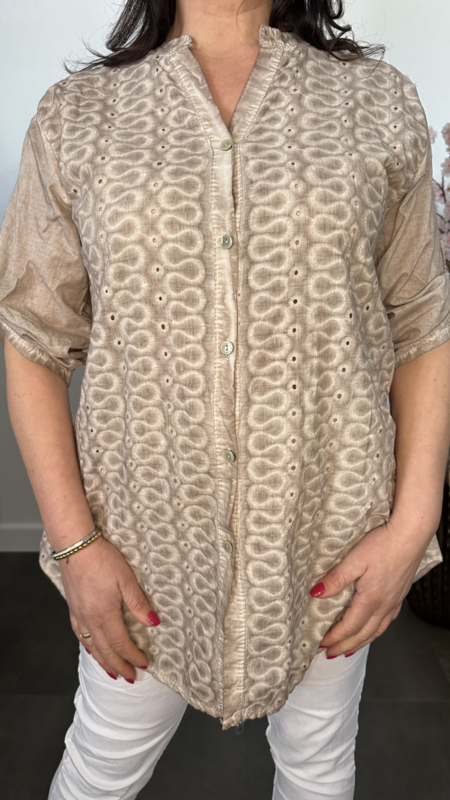 De blouse heeft een doorknoopsluiting en opgerolde mouwtjes die speels zijn vastgezet met een bandje. Het broderie voorpand in combinatie met de subtiele batik wassing geeft de blouse een unieke en bohemian uitstraling.