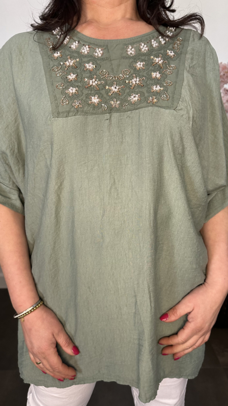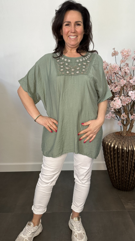 Deze elegante lange top is een echte eyecatcher dankzij de verfijnde details. Het borduursel, gecombineerd met subtiele glitteraccenten en parels, geeft de top een luxe en vrouwelijke uitstraling.