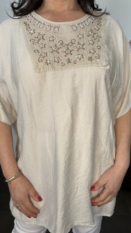 Deze elegante lange top is een echte eyecatcher dankzij de verfijnde details. Het borduursel, gecombineerd met subtiele glitteraccenten en parels, geeft de top een luxe en vrouwelijke uitstraling.