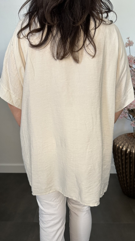 De linnenlook stof van viscose zorgt voor een luchtig en comfortabel gevoel, perfect voor warme dagen. Door het langere model valt de top mooi soepel en is hij ideaal te combineren met een legging, jeans of smalle broek.