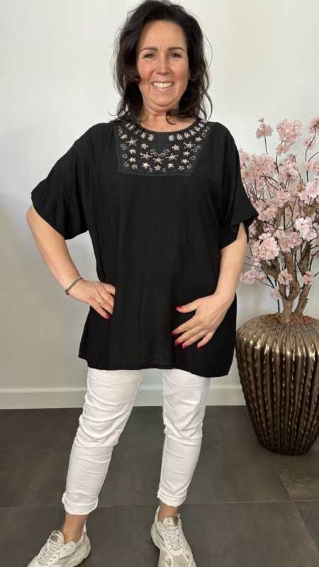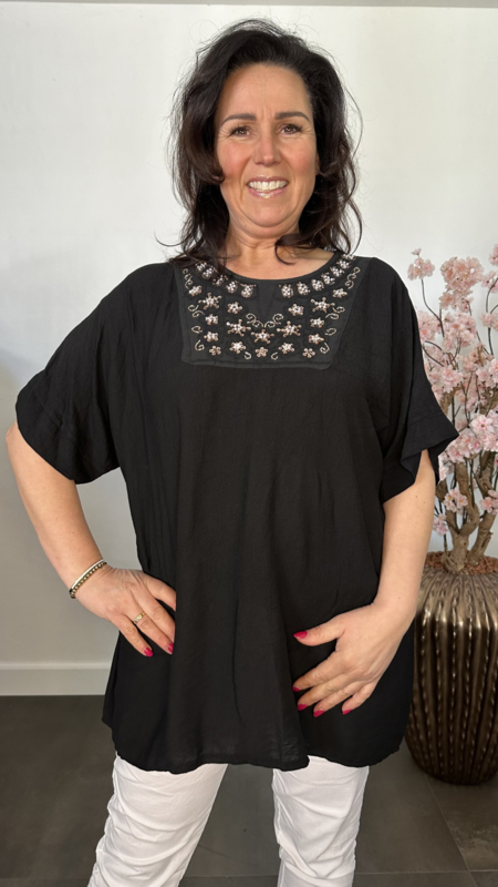 Deze elegante lange top is een echte eyecatcher dankzij de verfijnde details. Het borduursel, gecombineerd met subtiele glitteraccenten en parels, geeft de top een luxe en vrouwelijke uitstraling.