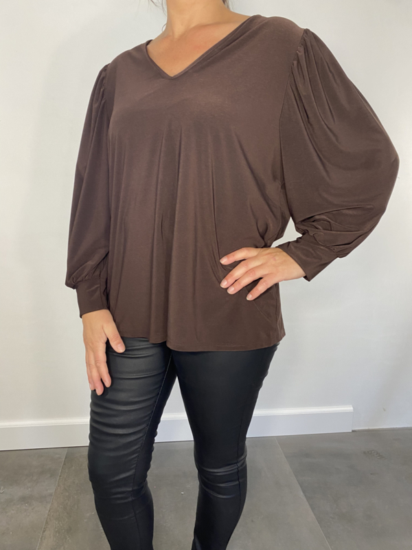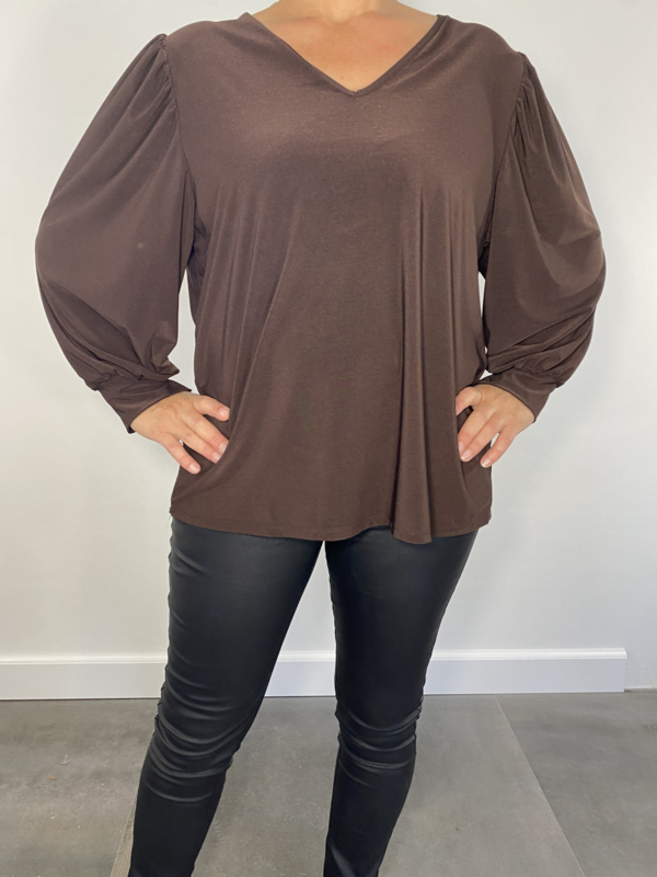 Shirt met v-hals en pofmouw travel donker bruin SALE