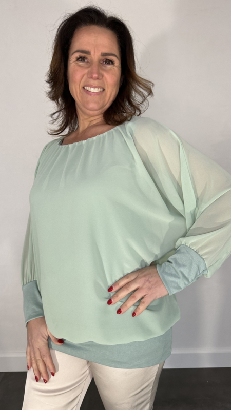 Een echte musthave deze gevoerde voile blouse met elastische boord en vleermuis mouw.
