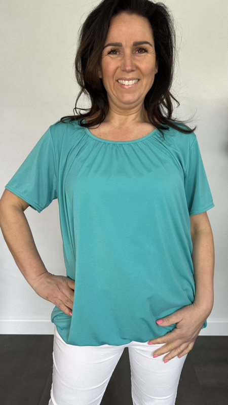 Ballon top met elastiek onderin , gemaakt van soepele gladde stretch stof, met korte mouw.